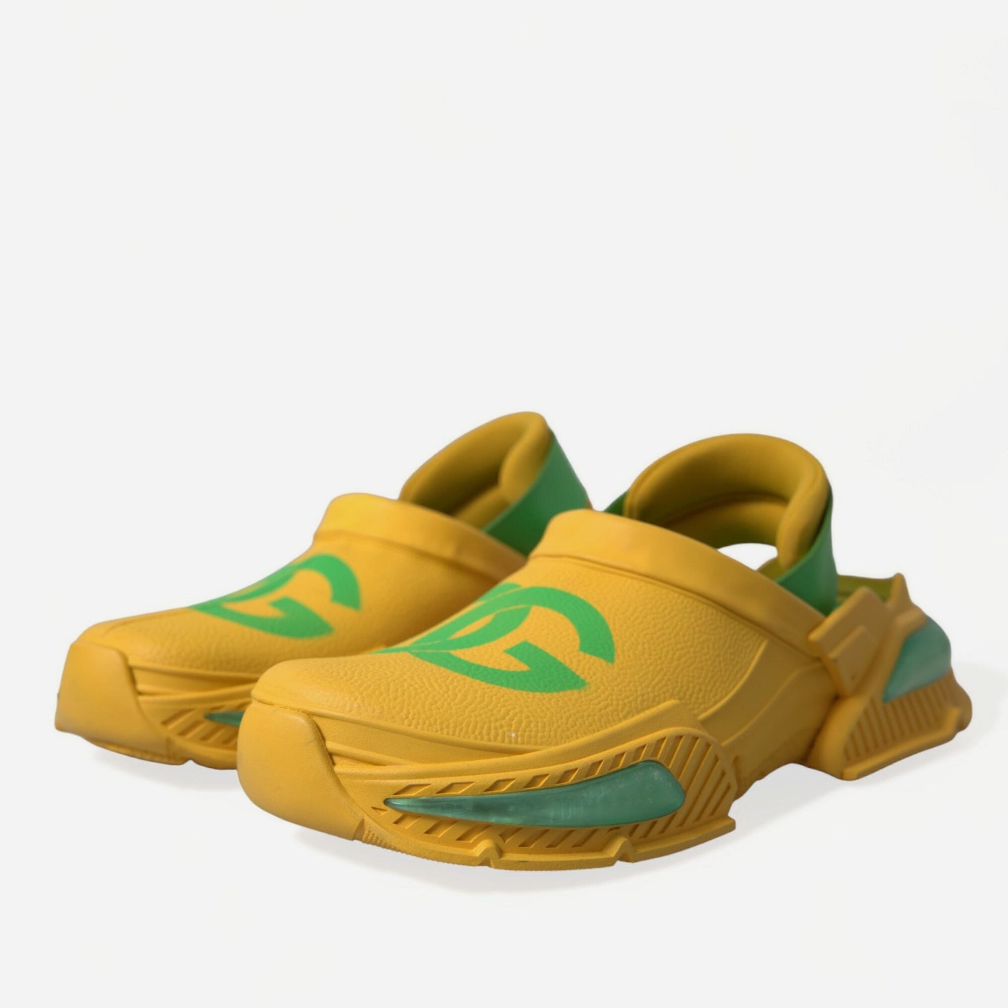 Влезте в света на комфорта и стила с нашите зашеметяващи нови чехли тип сабо. Изработени от най-фината гума, тези обувки са перфектна комбинация от лукс и практичност. Живият жълт нюанс, подчертан със зелени детайли, предлага поп цвят на вашия аутфит, докато издръжливата гумена подметка гарантира дълготрайно носене. Безупречно изработени от прочутите Dolce & Gabbana, тези чехли са синоним на италианско съвършенство.