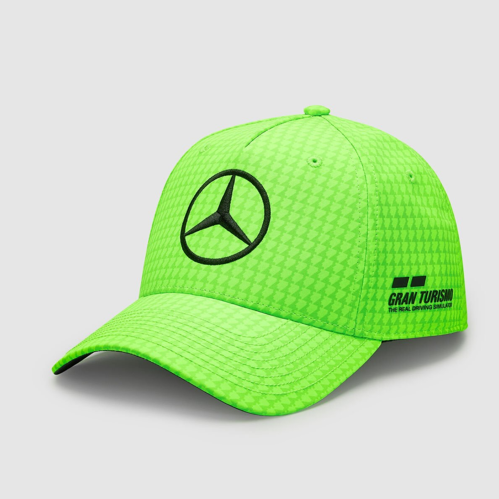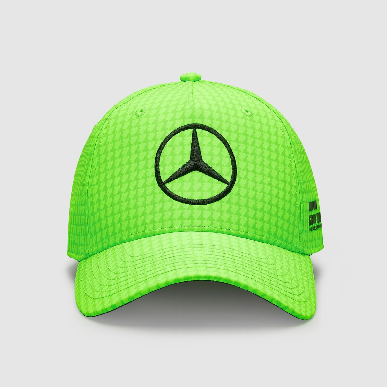 Special Edition Cap Silverstone Volt Green. To celebrate the 10th anniversary of him being a Mercedes-F1 driver, the Lewis Hamilton Baseball Cap is now available in various colour variants for the 2023 F1 season. The 5-panel baseball cap is designed in a houndstooth pattern and it is based on Lewis number 44. To be able to fit any head shape, the cap with the Mercedes star, Mercedes-AMG F1 team logo, Lewis Hamilton Wings as well as various other logos can be adjusted in size, thereby making it much more comfortable to wear in everyday use or on the race track.
